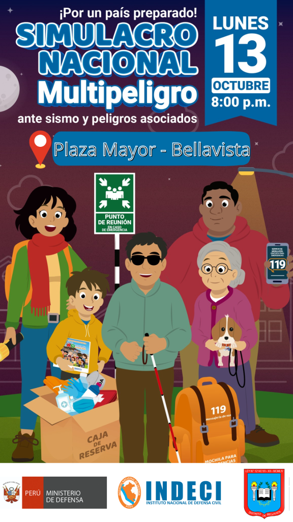 La Municipalidad de Bellavista reafirma su compromiso con la seguridad de todos los vecinos mediante la organización del Simulacro Nacional Multipeligro, que se llevará a cabo en la Plaza Mayor de Bellavista.